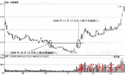 例如,2008年9月到2009年2月,華夏建通(600149)日K線走勢圖就是一種典型的底部島型突破缺口買點形態(tài),如下圖所示,在10月10日形成向下跳空缺口,而11月13日又形成向上跳空缺口,兩個缺口在同一價位附近,這一島型反轉缺口引發(fā)了較大的上升行情。