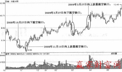 例如,2008年10月到2009年5月,力諾太陽(600885)日K線走勢圖就是一種典型的底部強勢突破買點形態(tài),如下圖所示。在2008年10月27日形成向下跳空缺口,而2008年11月10日又形成向上跳空缺口,兩個缺口不在同一價位附近,但出現(xiàn)向下跳空缺口時不需要放最配合,而出現(xiàn)向上跳空缺口時則有量能配合。該股走勢完全符合底部強勢突破買點技術要求,這一底部強勢突破缺口引發(fā)了后市較大幅度的上升行情。該股在2009年2月至3月的走勢中再次出現(xiàn)底部強勢突破買點,2009年2月27日形成向下跳空缺口,并于2009年3月27日形成另一個向上跳空缺口,底部強勢突破缺口后,股價大幅走高。