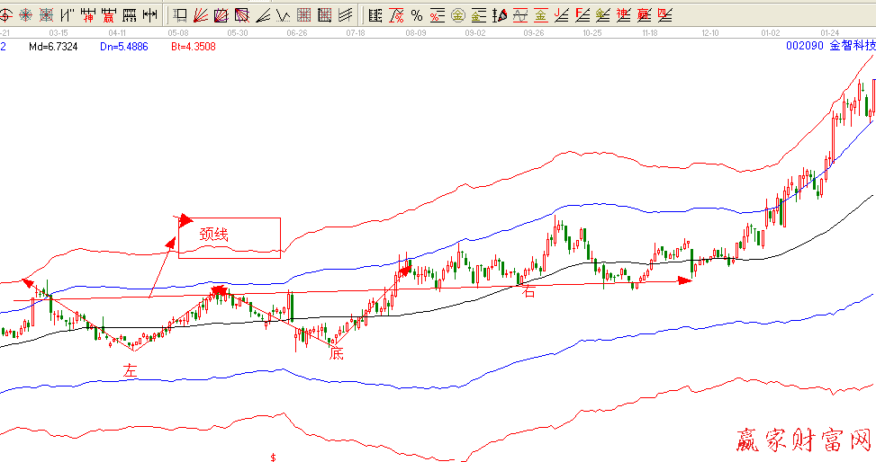 3.所謂的“肩”的位置(即橫盤整理的平臺)不應(yīng)太長,其時間在兩周附近,
