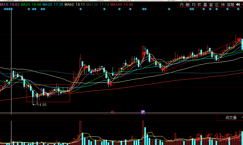爐架底線以底部反轉(zhuǎn)形態(tài)的姿態(tài)出現(xiàn),爐架底線形成后,股價上升幅度較為可觀。其重要的買點有兩個:一是中陽線出現(xiàn)當(dāng)日,股價盤中接近或超過大陰線開盤價時,投資者可迅速跟進;二是爐架底線形成次日,股價回抽至中陽線實體的1/2水平時,投資者可買進。