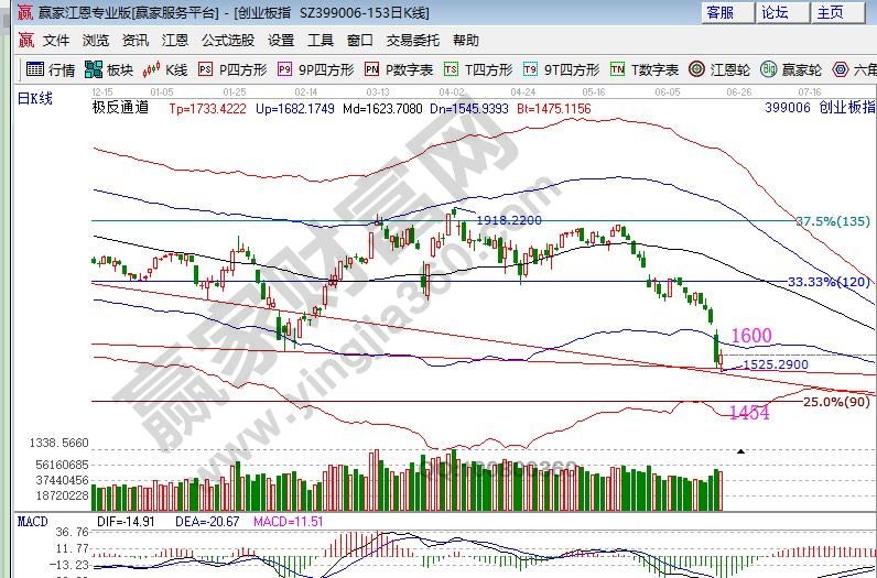 創(chuàng)業(yè)板月線極反通道弱勢(shì)下軌線是1530點(diǎn),以最近一波牛市(2012年-2015年)585點(diǎn)、4037點(diǎn)為起點(diǎn)和終點(diǎn)做波段百分比價(jià)格圖,90度是1453點(diǎn),接下來(lái)創(chuàng)業(yè)板指關(guān)注月線弱勢(shì)下軌線1530和日線百分比90度1453點(diǎn),反抽先看日線弱勢(shì)下軌線1600點(diǎn)位置。