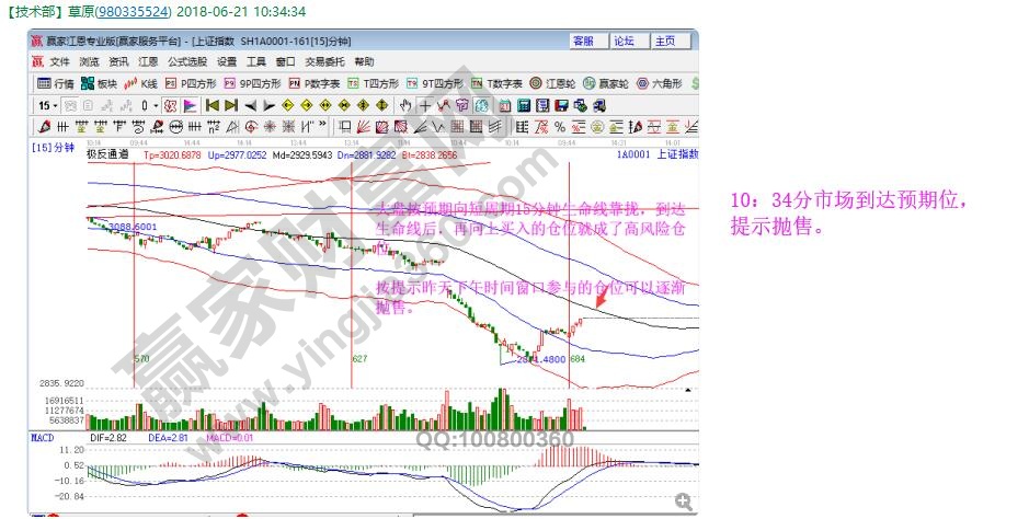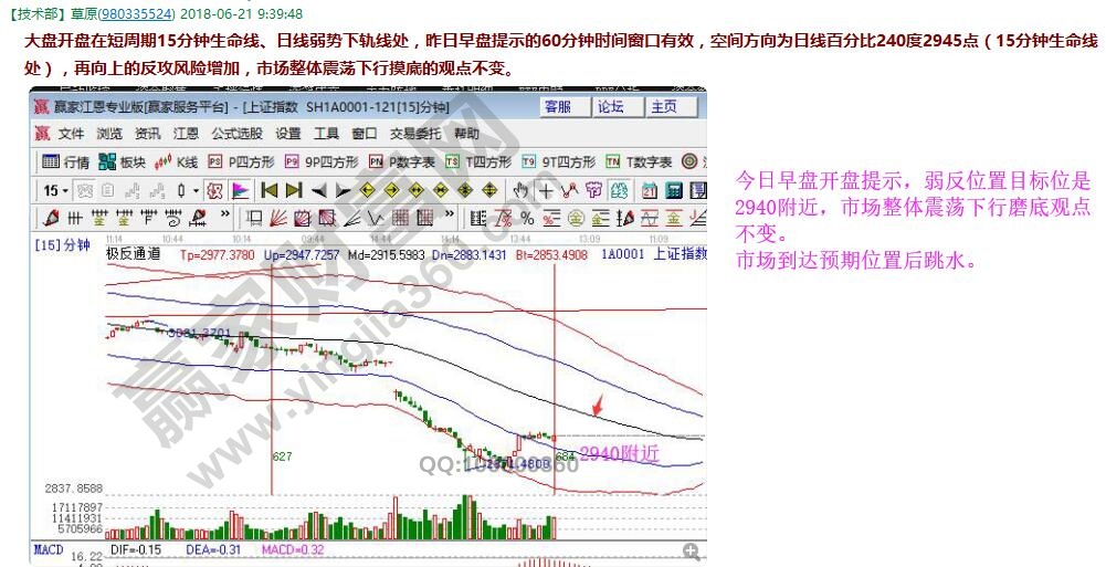 20號(hào)早盤提示短周期15、30、60分鐘均在趨勢(shì)工具極反通道紅色極弱外軌線處,下午第一個(gè)小時(shí)是時(shí)間窗,大盤會(huì)有一個(gè)弱反,當(dāng)天午盤到達(dá)了弱反的第一個(gè)目標(biāo)位2925點(diǎn),公眾號(hào)文章談到,今天順勢(shì)上攻2945附近則完成本次弱反,并且早上到達(dá)位置提示拋售,一次公開(kāi)的操作結(jié)束,等待贏家江恩系統(tǒng)工具再次發(fā)出趨勢(shì)、時(shí)間、價(jià)格共振性參考位,會(huì)繼續(xù)給大家展示工具的實(shí)戰(zhàn)效果。