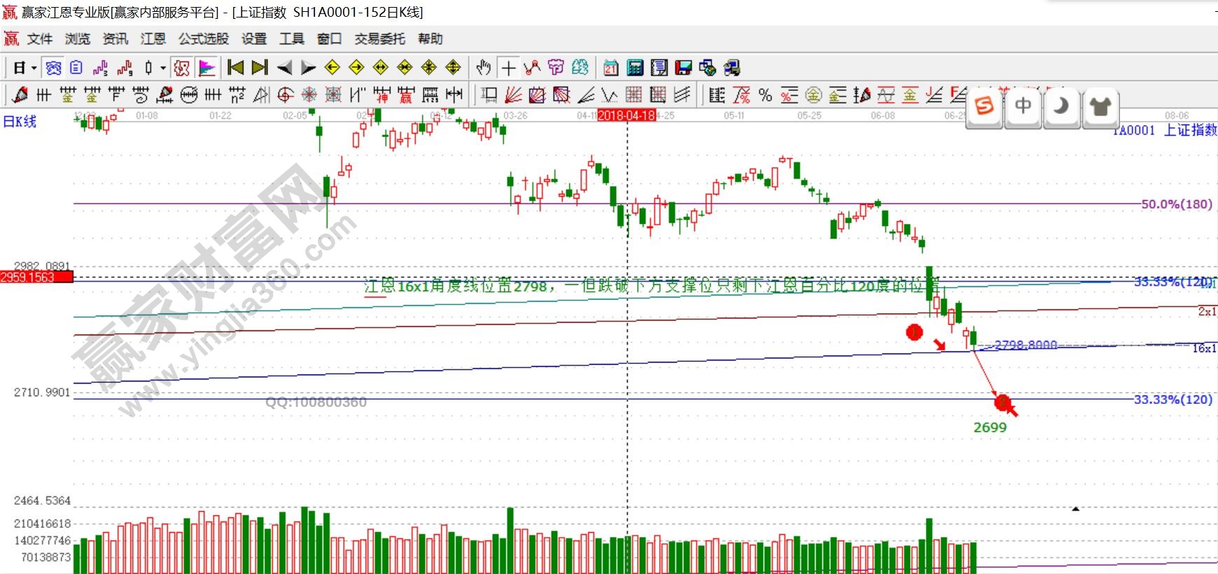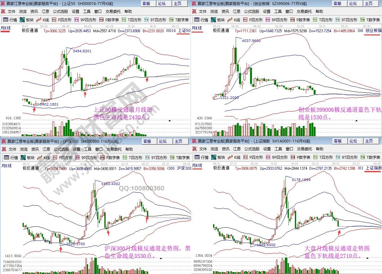 以上四張圖分別是上證50、創(chuàng)業(yè)板指、滬深300、上證指數(shù)的月線級別極反通道走勢圖,從圖形上可以看出,月K線跌至生命線或藍(lán)色下軌線,嚴(yán)格按工具規(guī)則,市場持續(xù)大幅殺跌的概率不大,純技術(shù)性低點(diǎn)已不遠(yuǎn)了,但市場投資的情緒是無法掌。維持6月底或7月上旬市場出現(xiàn)階段底部的觀點(diǎn)不變,本周是周線時(shí)間窗,快速下跌產(chǎn)生的低點(diǎn)有參考意義,未來走反彈或橫盤的概率較高,將通過贏家江恩系統(tǒng)工具繼續(xù)跟蹤解讀。