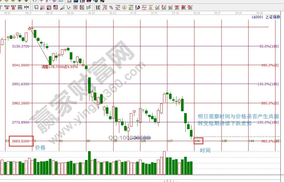 萬物負(fù)陰而抱陽 沖氣以為和,事物發(fā)展都遵循自然法則,全則必缺,極則必反。市場一跌再跌,何時才會扭轉(zhuǎn)呢?江恩老先生通過時間周期法則,揭示市場漲跌規(guī)律。滬指日線時間變盤點,7號是等距離時間窗(點位對應(yīng)2691),周線方面下一周是時間窗(點位對應(yīng)2638); 空間方面,如圖,2683點是零度位置,極反通道月線藍(lán)色下軌線2680,周線藍(lán)色下軌線是2600點,日線藍(lán)色下軌線是2640點,價格上多個重要位置都在指向2600--2700這個區(qū)間,然后結(jié)合著時間窗口,尋找時價共振位,這是短線參考位。