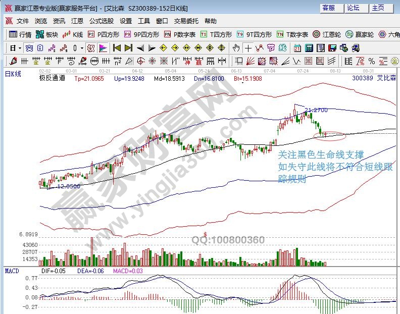 明天新增加一個短線標(biāo)的艾比森,通過下圖工具極反通道可得出,股價突破藍(lán)色外軌線失敗,按規(guī)則失守一線看低一線,股價回落到黑色生命線,強(qiáng)勢股調(diào)整還在延續(xù),明日盤中跟蹤確認(rèn)生命線支撐有效性,失守則停止跟蹤。
