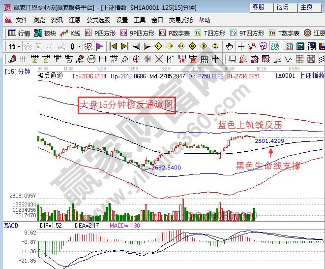 市場再次給做多投資者當頭一棒,低開全天一路走低單邊下跌,收盤正好落在短周期15分鐘極反通道生命線位置,此線是贏家江恩系統(tǒng)短線操盤參考線,市場在線上則具備操作機會,反之就是休息,2792點的弱反是否還能延續(xù)就是看此線得失,跟蹤周四早盤多空爭奪結(jié)果,收復則看高一線至藍色上軌線2790,失守則看低一線2690。