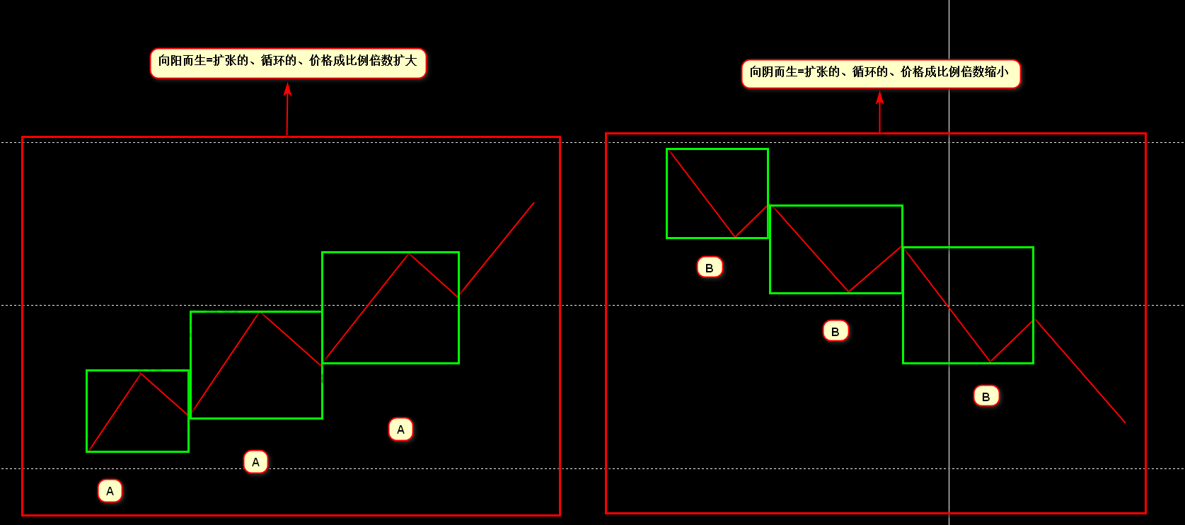 如圖二所示,通過圖二我們可以看出無論上升趨勢還是下降趨勢都是這兩個結(jié)構(gòu)的無限復(fù)制,而做股票更應(yīng)該關(guān)注A結(jié)構(gòu),而A結(jié)構(gòu)又分成了上漲和下跌的兩段,上漲段體現(xiàn)的就是和主趨勢的方向一致性,下跌段體現(xiàn)的就是和主趨勢的方向分歧性,從這個角度來看我們更應(yīng)該研究A結(jié)構(gòu)里分歧段的界定標準。