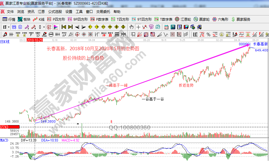 對照長春高新2018年10月至2020年5月的走勢圖去看,股價創(chuàng)出149低點后,持續(xù)攀升至今。期間走勢,波峰一個高于一個,波谷也逐步抬高,近1年半的長期時間跨度內(nèi),雖有小的折返運行,但走勢上呈現(xiàn)出明顯的上升方向。這種整體向上運行的態(tài)勢就是上升趨勢。