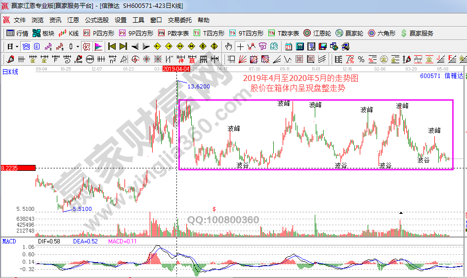 對照信雅達(dá)2019年4月至2020年5月的走勢圖去看,股價創(chuàng)出13.62的高點后回落至8元附近,之后1年的期間:走勢波谷波峰交替出現(xiàn),股價在8元至13元的箱體內(nèi)震蕩運行,沒有明顯的向上或向下,這種整體橫盤運行的態(tài)勢就是盤整趨勢。