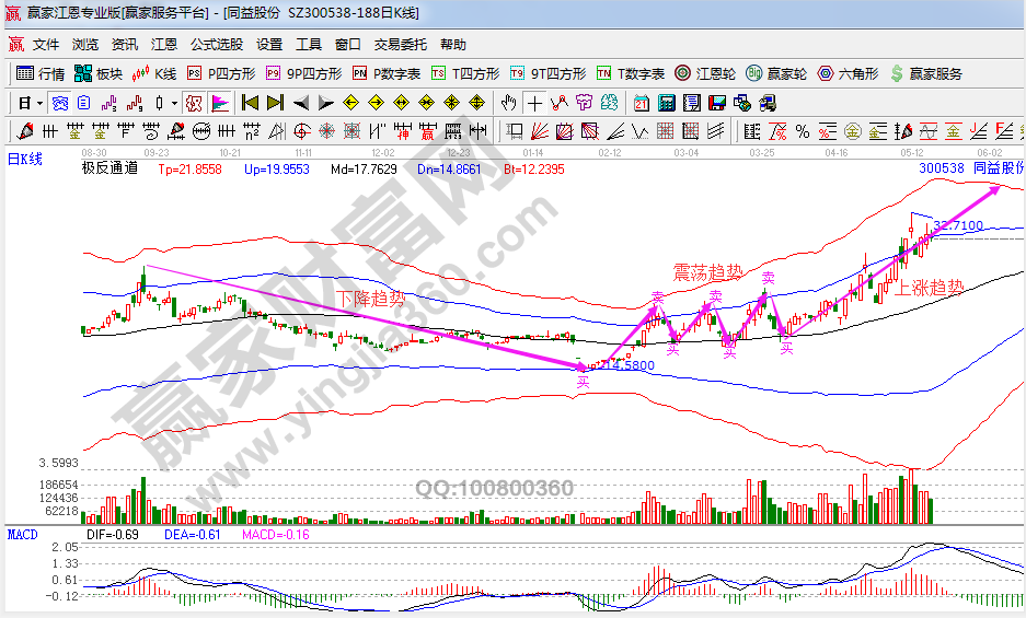 綜上而言,股價處于上升趨勢,積極操作耐心持股贏取大波段利潤;股價處于下跌趨勢,管住手耐心持幣等待新的機(jī)會;股價處于盤整趨勢,可以結(jié)合價格波動的支撐和阻力,進(jìn)行小波段低吸高拋。在趨勢的具體應(yīng)用上,給大家推薦一個經(jīng)典工具:極反通道。通過5條線,直觀量化趨勢方向及波動空間。