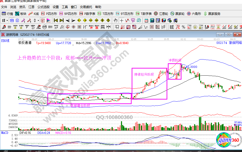 這里分享一張游族網(wǎng)絡(luò)2019年8月至 2020年2月的這一段上升趨勢圖,借助贏家江恩特色趨勢判定工具極反通道,可以看到:股價在極反通道藍色下軌線處獲得支撐止跌回升,之后圍繞生命線持續(xù)震蕩整理,主力在底部階段反復(fù)震蕩吸籌的同時,逐步打開上升空間;一旦時間到達,對應(yīng)量能放出,股價就直接進入到持續(xù)拉升階段,一波上漲從生命線到紅線,30個交易日近一倍的漲幅,抓住這一波行情可真是魚肥肉美!而:當(dāng)股價擊穿紅線的回落走勢,在藍線休整后,再度出現(xiàn)快速上攻,這就是最后的沖頂出貨階段了。對應(yīng)圖形,股價創(chuàng)出新高,量能及MACD不能跟隨創(chuàng)新高,則上升趨勢結(jié)束,應(yīng)即時高拋離場!