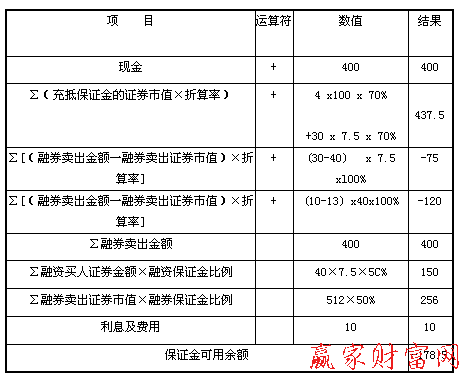 假定以8元/股全部賣出A股票50萬(wàn)股,以30元/股賣出B股票10萬(wàn)股,共計(jì)得款700萬(wàn)元。還款后保證金可用余額計(jì)算如下表。