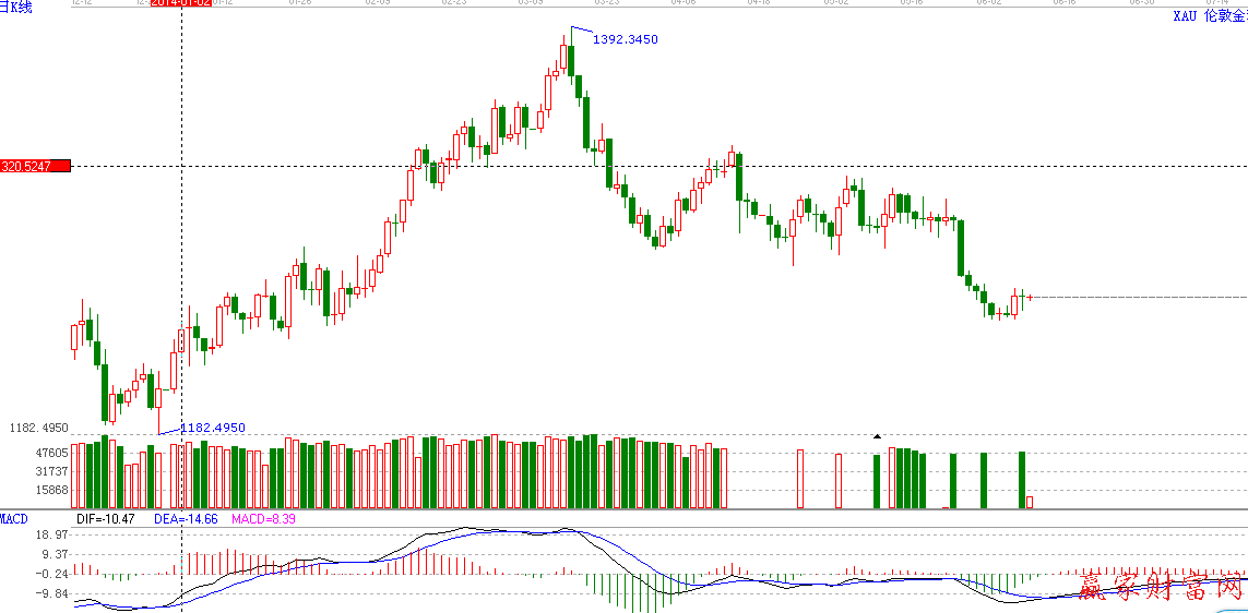 現(xiàn)貨黃金日k線圖中,金價(jià)較前一交易日出現(xiàn)上漲,現(xiàn)貨黃金日內(nèi)交易最高觸及1256.80美元/盎司,最低下探1240.99美元/盎司,較上一個(gè)交易日開盤價(jià)1243.70美元/盎司上漲9.20美元,漲幅0.74%,報(bào)1252.90美元/盎司。日內(nèi)金價(jià)上方一直在10日線之下運(yùn)行,10日線為其阻力位,后市發(fā)展要首先觀察是否突破10日均線。在10日均線壓制之下,黃金的日線形態(tài)將短期或者持續(xù)均線下小箱體內(nèi)震蕩。10均線走勢(shì)趨于平滑,其余均線分散下滑,短期內(nèi)走勢(shì)變化不大。MACD指標(biāo)雙線在零軸之下處于超賣區(qū)間,粘合前行,藍(lán)色動(dòng)能柱微量減少。目前黃金呈狹窄區(qū)間整理,但是下行趨勢(shì)也是較為明顯的,黃金短線或突破震蕩區(qū)間,呈單邊下行趨勢(shì)。