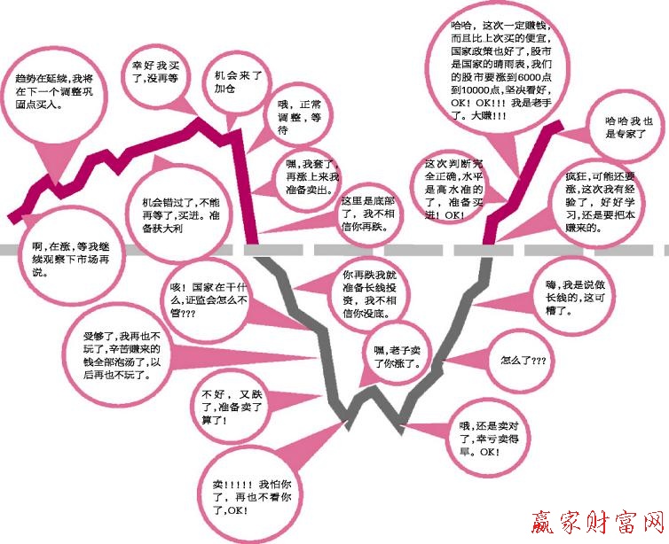從下圖,我們可以明顯看出,有些投資者懂得順勢(shì)而為和追漲殺跌,而有些人卻心存僥幸心理,最后虧損巨大。當(dāng)股價(jià)呈現(xiàn)持續(xù)上漲的時(shí)候,股民會(huì)做一段時(shí)間的觀察,等到股價(jià)漲了一段時(shí)間以后,股民就開(kāi)始買入。此時(shí),股價(jià)一直在上漲,當(dāng)股價(jià)創(chuàng)出新高的時(shí)候,股民就沾沾自喜,而股價(jià)創(chuàng)出低點(diǎn)的時(shí)候,股民就開(kāi)始加倉(cāng),實(shí)行套牢政策。但是,股價(jià)卻仍然只跌不漲,這個(gè)時(shí)候股價(jià)創(chuàng)出了一個(gè)新低,股民就開(kāi)始焦躁不安了,于是就急忙賣出。但是,當(dāng)賣出以后,股價(jià)卻又開(kāi)始上漲,這時(shí)股民后悔不已。但是,股價(jià)上漲了一段時(shí)間之后,又開(kāi)始下跌了,并且又創(chuàng)出一個(gè)新低,這時(shí)股民則十分慶幸自己已經(jīng)賣出。但是,股價(jià)在創(chuàng)出新低以后,又開(kāi)始上漲,做長(zhǎng)線的股民開(kāi)始后悔不已,后來(lái)股價(jià)持續(xù)上漲,股民也開(kāi)始大量買入,最后大賺。以上這些就是廣大的投資者在做投資的時(shí)候的心理變化圖。