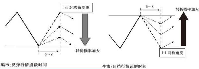 在進行逆勢計算行情的崩潰時機的時候,角度時間模型是非常重要的,這也是行情分析的關(guān)鍵所在。下面的兩張圖形顯示的就是這兩種角度時間模型是有針對性的,如果用錯了牛熊黃精,那么我們就得不償失了,這一點大家一定要注意。