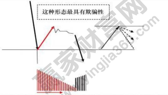 這種形態(tài)往往是具有欺騙性,這種形態(tài)會被誤認(rèn)為是強勢上攻形態(tài),一旦出現(xiàn)急速的下跌放量,上攻的行情就會被徹底瓦解。