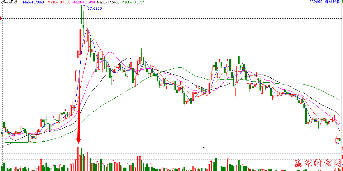 002499科林環(huán)保屬于機(jī)械行業(yè)板塊,節(jié)能環(huán)保行業(yè)板塊,近期環(huán)保之風(fēng)盛行,節(jié)能環(huán)保板塊穩(wěn)步上漲,板塊漲幅0.25%,個(gè)股方面科林環(huán)保領(lǐng)漲,其他個(gè)股緊跟其后。在2013年10月18日,科林環(huán)保個(gè)股當(dāng)天成交量創(chuàng)出短期新高,當(dāng)天股價(jià)收小陽(yáng)線,之后的第二天開始創(chuàng)出31.32的高點(diǎn),也就是我們所說(shuō)的天量之后出現(xiàn)天價(jià),這一高位天量也預(yù)示著風(fēng)險(xiǎn)。我們觀察高點(diǎn)吊頂小陰線實(shí)體,也可以判斷股市見頂,此時(shí)應(yīng)該及時(shí)離場(chǎng)。