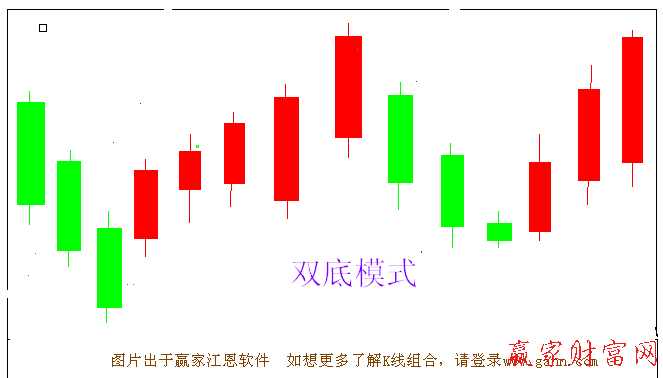 上圖是我做出的雙底模式的簡(jiǎn)單圖形,我們可以看到它的主要構(gòu)成是先有幾個(gè)下跌趨勢(shì)的陰線構(gòu)成然后到達(dá)底部后有一系列上升的陽(yáng)線構(gòu)成多頭排列,接著發(fā)生上了技術(shù)型回調(diào),最后又一次呈現(xiàn)多頭趨勢(shì)。我們必須知道雙底的第二個(gè)底一定要比第一個(gè)底高。這個(gè)模型是短期波段,持續(xù)的周期很短只有一周到一個(gè)月之間。但是它的漲幅比較大,大概在百分之五十左右,并且它的盈利約在百分之三十期間。對(duì)于這個(gè)追漲模式在平時(shí)的k線分析中很容易遇到,分析也很簡(jiǎn)單,所以是我們軟件分析工具以及股票運(yùn)營(yíng)中的常客,例如下圖中的呈現(xiàn):
