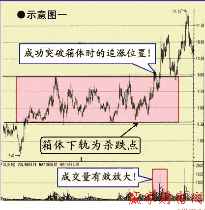 股票在一段時間內一直在箱體內來回整蕩,在成交量逐步放大,并突破箱體頂部之后股價拉升,當突破后就是追漲的買點。如示圖一:
