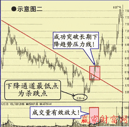 當一只股票一直在走下降通道,而在某一段時間股價向上突破了這個下降通道時追進去。如示圖二: