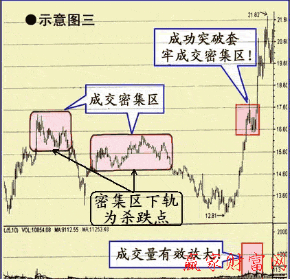 在股票成交密集區(qū)后突破時候追進去,在密集區(qū)有很多的套牢盤,一旦突破,就表示主力有意要拉高股價,正式買入股票的時候。如示圖三: