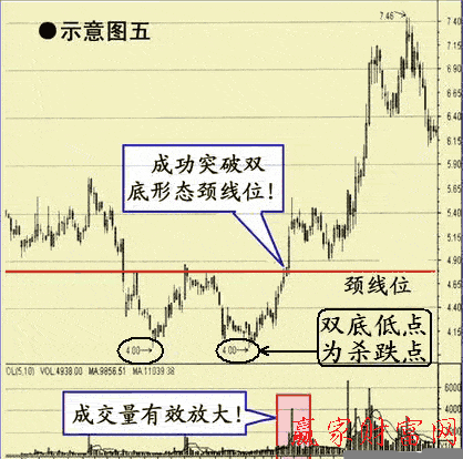 在突破頸線的時候買入,這時候都是看多。出現在雙底、雙頂,頭肩底、頭肩頂,多重底、多重頂等都能畫上頸線,如示圖五: