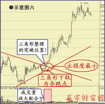 股票在上漲后出現三角形的整理時候,在突破這種形態(tài)后追入,如示圖六