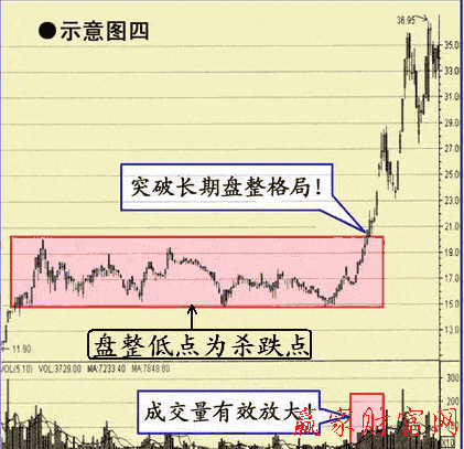 咋看的時候覺得跟箱體突破有點像,兩者的區(qū)別在于箱體波動幅度比較大。如示圖四: