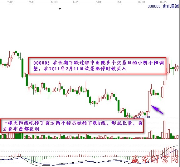 個(gè)股在上升趨勢中出現(xiàn)小陽小陰的的四到六個(gè)交易日或者更多的調(diào)整,成交量也出現(xiàn)萎縮,在之后的某一天出現(xiàn)漲停的陽線,在尾盤追入。比如鑫科材料(600225)在2011年3月4日出現(xiàn)買點(diǎn)