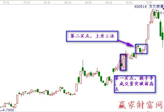 注:這是方大炭素(600516)在2010年11月1日出現(xiàn)上升三法的買點(diǎn)。如果當(dāng)日出現(xiàn)的陽線是漲?;蛘逿字線,成交量和換手率都高于第一個(gè)陽線可以獲得更多的利潤。