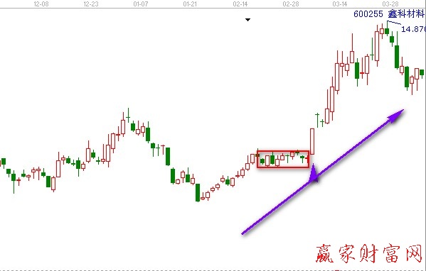 在底部形成多個(gè)交易日的小陰小陽的調(diào)整,調(diào)整時(shí)間越久,上升空間越大。某一天出現(xiàn)大陽線時(shí)追入。