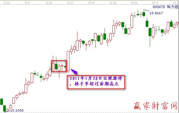 個(gè)股在走出新的高點(diǎn)的趨勢中,也是出現(xiàn)小陰小陽的調(diào)整后出現(xiàn)大陽線后追入。比如:科力遠(yuǎn)(600478) 在2011年1月28日突破新高后連續(xù)多個(gè)交易日收出上影線,但不跌破創(chuàng)新高交易日的開盤價(jià)。