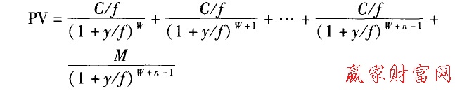 公式中,PV表示債券全價(jià);f表示債券每年的利息支付頻率;以D表示從債券交割日到下一次付息日的實(shí)際天數(shù),W=D/(365/f);M為債券面值;n為剩余的付息次數(shù);n-1為剩余的付息周期數(shù);C為當(dāng)期債券票面年利息;y為投資者自己確定的收益率,或市場平均投資收益率。