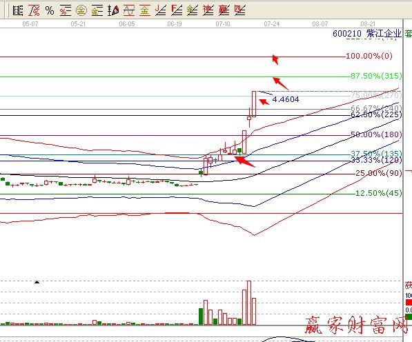 江恩價(jià)格百分比135度位置價(jià)格是3.43那里獲得支撐,有支撐配合消息,是可以參與的,只要支撐不破,就可以持有,站穩(wěn)一線,看高一線,135度上一線是180度位置,價(jià)格是3.75元,這個(gè)位置就是從3.43那里買入的第一目標(biāo)。因?yàn)橄?lái)實(shí)質(zhì)性利好消息,所以股價(jià)很快到達(dá)第一目標(biāo),那就繼續(xù)提高止盈位,繼續(xù)看高一線,今天再度漲停,目前該股支撐是在4.37附近,如果該位置不破,就繼續(xù)看高,目標(biāo)是4.68元,如果4.68元順利到達(dá),下一個(gè)目標(biāo)就是5元。