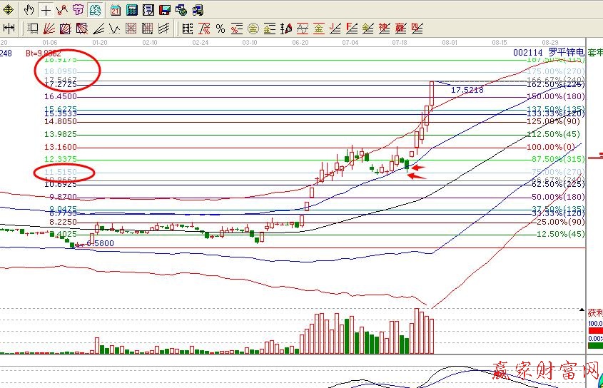 極反通道藍色上軌線和獲得百分比的支撐,買點即出現(xiàn)。如果沒有把握住的話,也應(yīng)該給與重點關(guān)注該股。贏家江恩團隊在23號公開展示該股,因為符合極反通道的操作規(guī)則。23日當天漲停,那就可以繼續(xù)持有。近日,大盤表現(xiàn)良好,像002114這樣的在強勢通道的個股我們只需要提高止盈位來保護收益即可。強者恒強,002114在極反通道的超強通道果然不負眾望,從23日到今天,4個交易日給了3個漲停。今天在“煤飛色舞”的帶動下再次漲停,這是趨勢的力量,強勢趨勢的方向還沒有改變,投資者只需提高止盈位,拿好手里的籌碼就可以了。今天的漲停價是17.52元,從