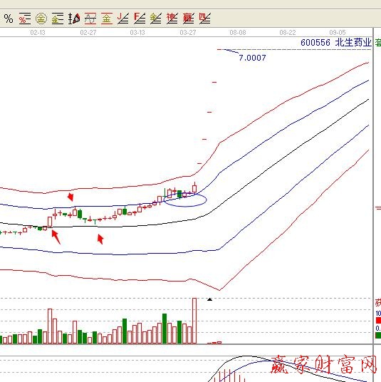 極反通道生命線,到達強勢區(qū)域。在生命線上的個股是強勢的,是可以給與關(guān)注操作的。站穩(wěn)一線,看高一線,一線未突破,回調(diào)一線。從圖中看出,買點,賣點都很明確。