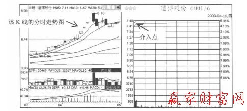 圖所示為道博股份(600136)的日K線圖和分時(shí)走勢(shì)圖,該股經(jīng)過不斷上漲后,開始時(shí)還上漲,連續(xù)兩個(gè)漲停后,第三個(gè)交易日高開并在開盤5分鐘內(nèi)拉出漲停。