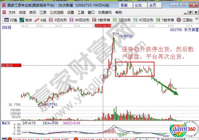 第二種出貨板,最近市場(chǎng)溫州幫操作的股票都成了妖股,做盤(pán)手法犀利,低部吃貨夠后,利用資金優(yōu)勢(shì)造勢(shì)吸引市場(chǎng)眼球,然后以跌停板方式出貨,連續(xù)兩三個(gè)跌停,往往給散戶以為買(mǎi)到便宜貨,其實(shí)主力的成本更低,一個(gè)反彈順利出貨。